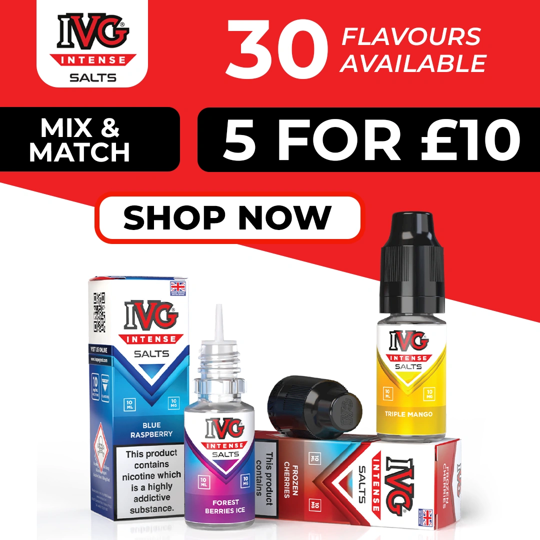 IVG Intense Salts are available in 10mg and 20mg nicotine strengths, designed to deliver quick craving relief with smooth vapour and strong, disposable-style flavour.